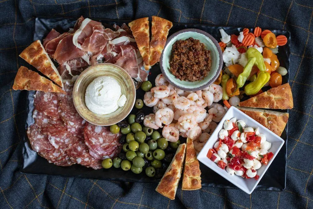 An ideal grazing table that will satisfy every guest, featuring an assortment of meats, dips, breads, crackers, fruits, homemade sausage rolls and pies, as well as house-made frittatas and spring rolls.